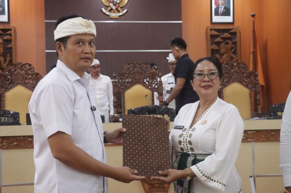 PETABALI, Jembrana – Bupati Jembrana I Made Kembang Hartawan bersama para pimpinan DPRD Jembrana Menandatangani Peraturan Daerah (Perda) Pembentukan dan Susunan Perangkat Daerah resmi disahkan. Pengesahan Ranperda tersebut, dilaksanakan pada Sidang Paripurna yang dipimpin langsung oleh Ketua DPRD Ni Made Sri Sutharmi di ruang Sidang Utama DPRD Jembrana, Jumat (8/8/2025).