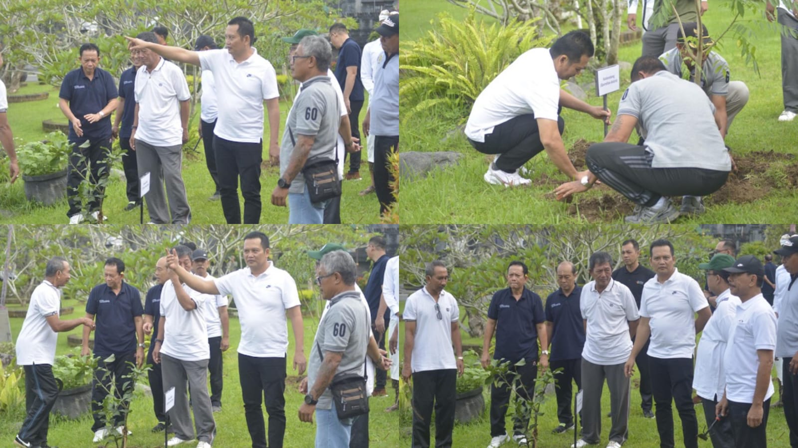 PETABALI, Jembrana – Bupati Jembrana I Made Kembang Hartawan didampingi Nyonya Ani Setiawati menanam puluhan bibit pohon ucapan selamat dari masyarakat di areal Kebun Raya Jagatnatha Kabupaten Jembrana, Jumat (14/3/2025). Bibit pohon tersebut sebagian besar jenis tanaman upakara, sebelumnya berjejer di halaman Kantor Bupati Jembrana kiriman stake holder dan lapisan masyarakat sebagai ucapan selamat atas pelantikan Bupati Jembrana I Made Kembang Hartawan dan Wabup Jembrana I Gede Ngurah Patriana Krisna.
